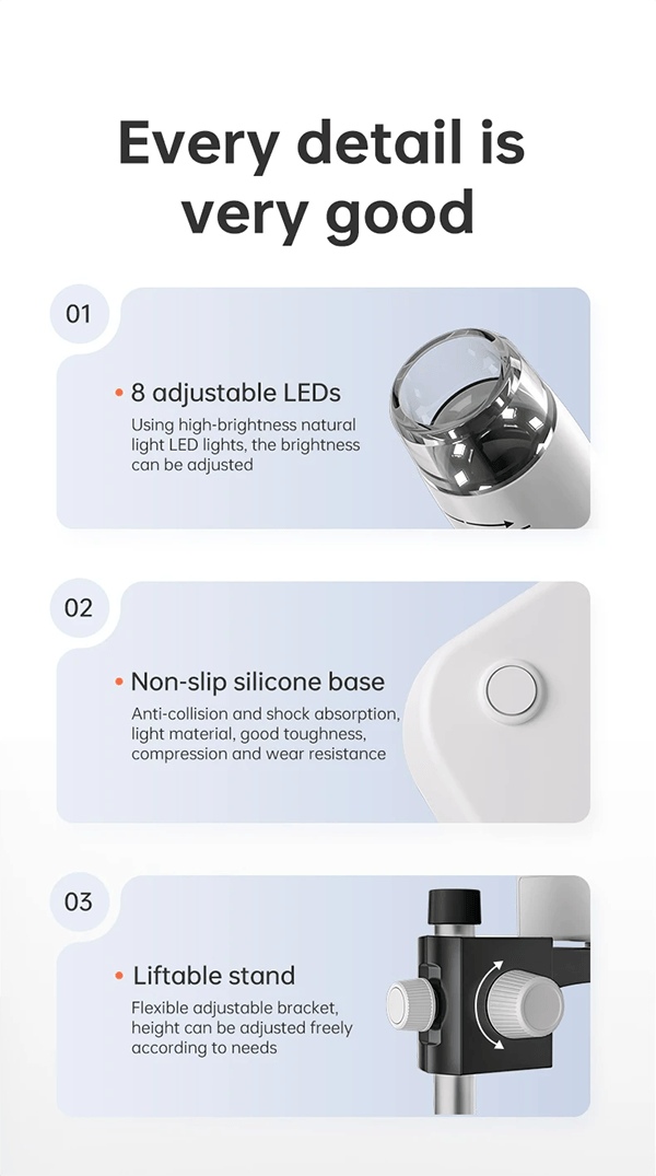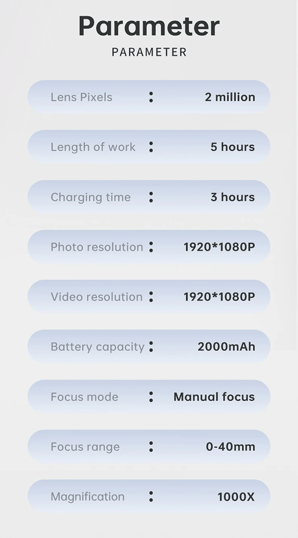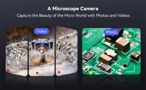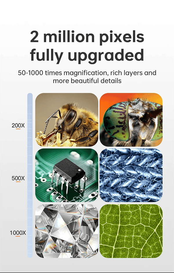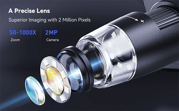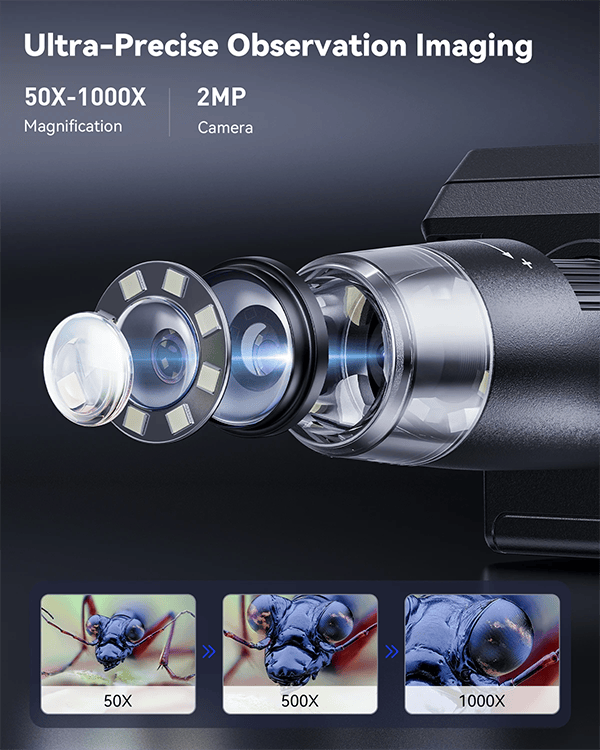2.【50X-1000X Continuous Magnification Zoom】- Allows you to zoom in and view incredible detail in the 50X to 1000X magnification range. The actual magnification differs due to the screen size, the distance between the camera, and the observations.