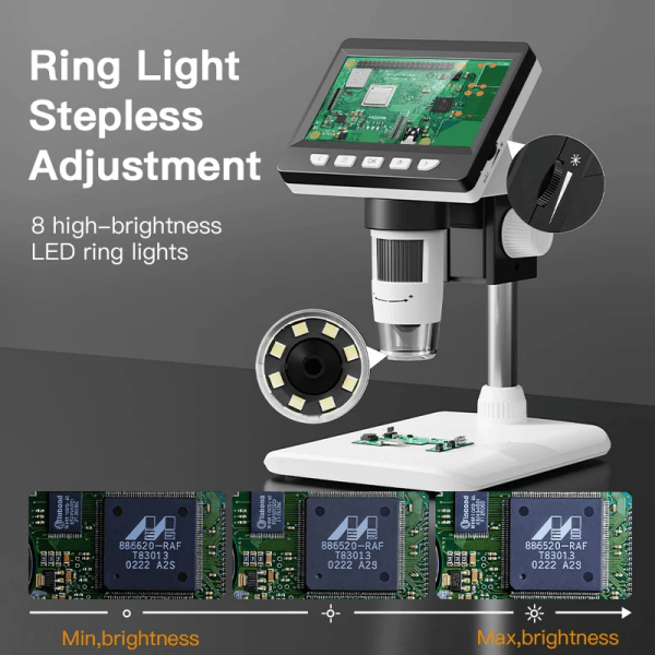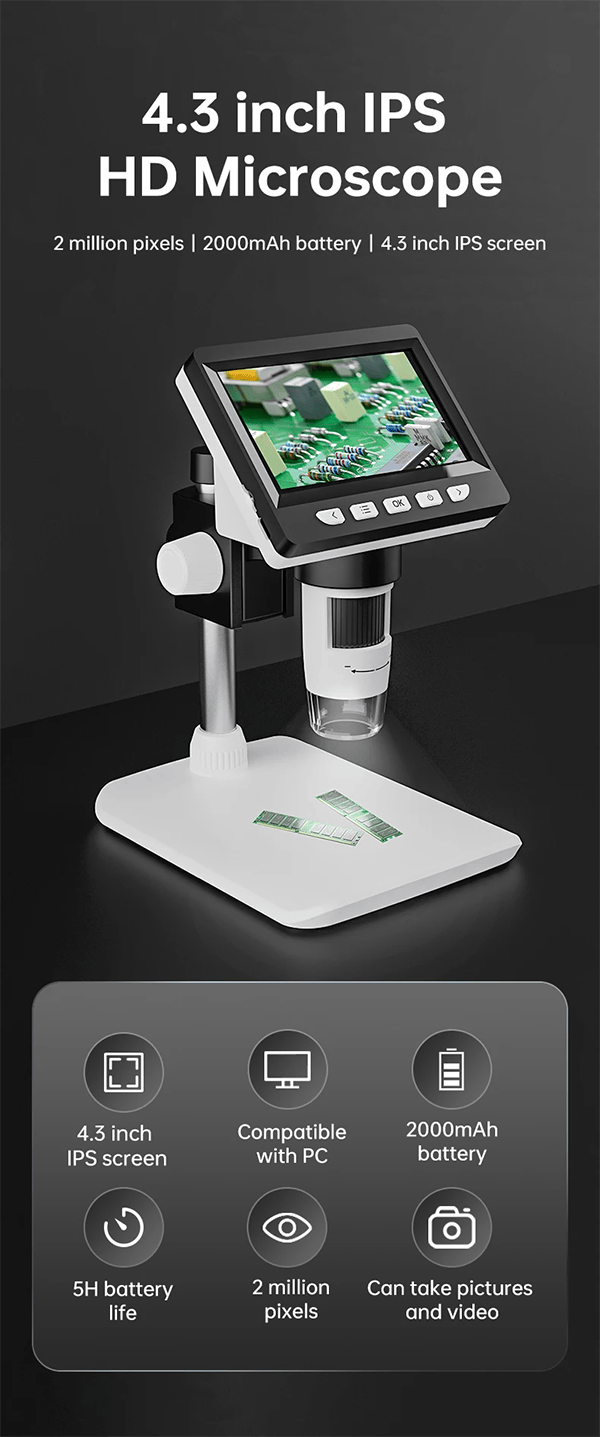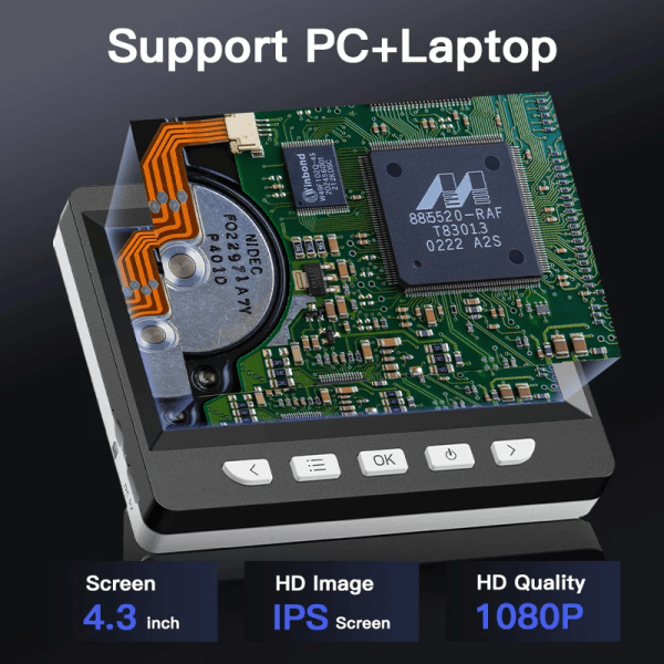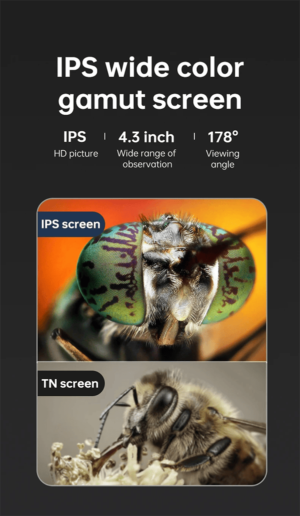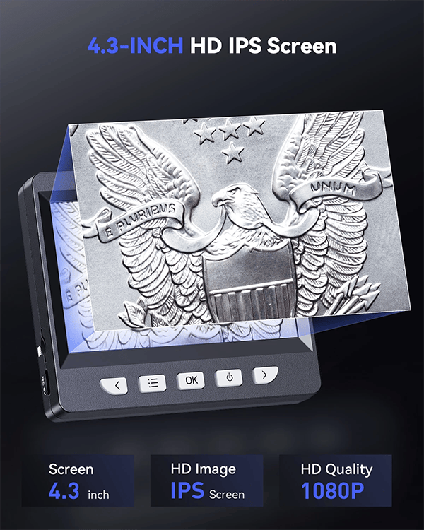 1.【4.3 inch Full Color HD IPS Screen】- Using 1080P high-definition lens, the 4.3inch IPS screen displays real-time clear images and high-quality video, with 8 LED fill lights. Compared to traditional eyepieces, the large screen enhances ergonomics and eliminates eye and neck strain.