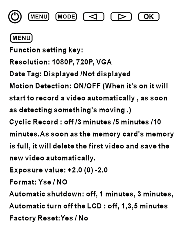 3. Motion Detection: ON/OFF (When it’s on it will start to record a video automatically , as soon as detecting something’s moving .)